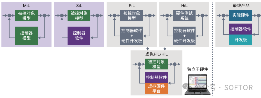 | MiL | Model-in-the-Loop | 模型在环测试 | 在模型层面进行仿真测试,验证模型逻辑正确性 | Simulink/Stateflow等建模环境 |